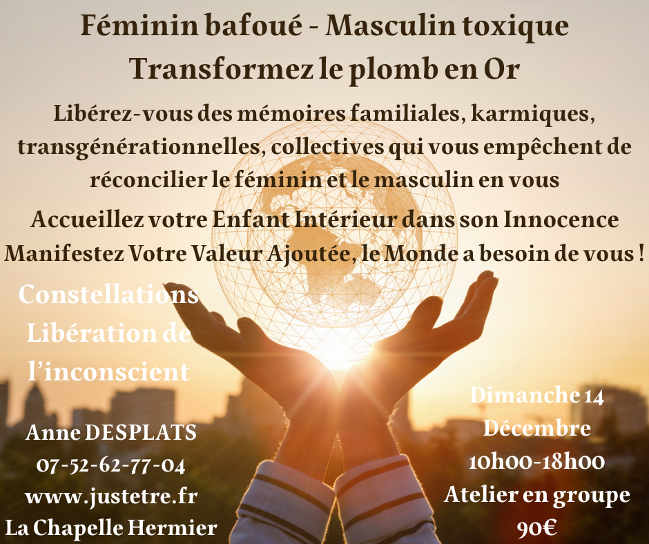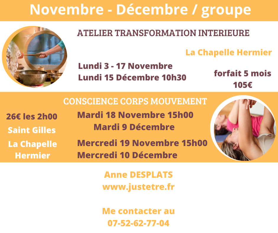 Chaque mois, je vous propose un atelier thématique de transformation intérieure (ex: Prendre sa place, Ouvrez-vous à vos potentiels, Tu es Unique Oses l’Etre!…)